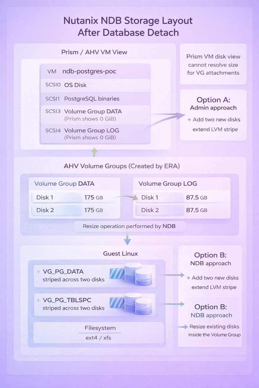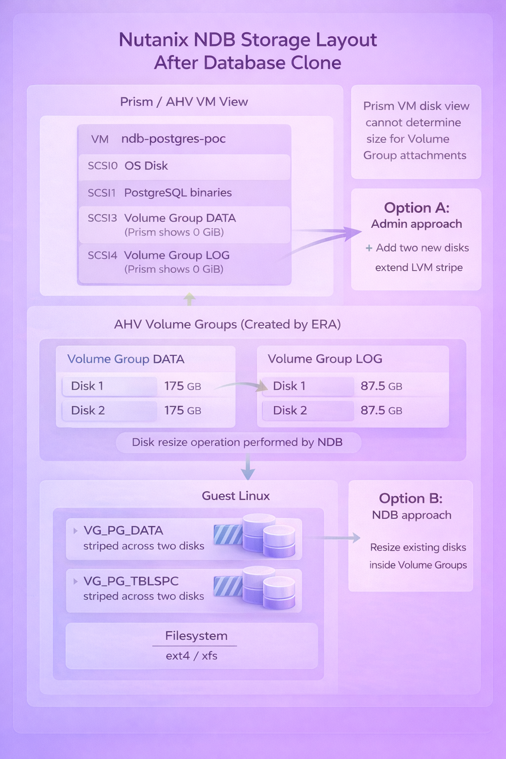 The key insight: NDB manages storage at the Nutanix layer, but the guest OS owns standard LVM and filesystems. Nothing proprietary at the data level.
