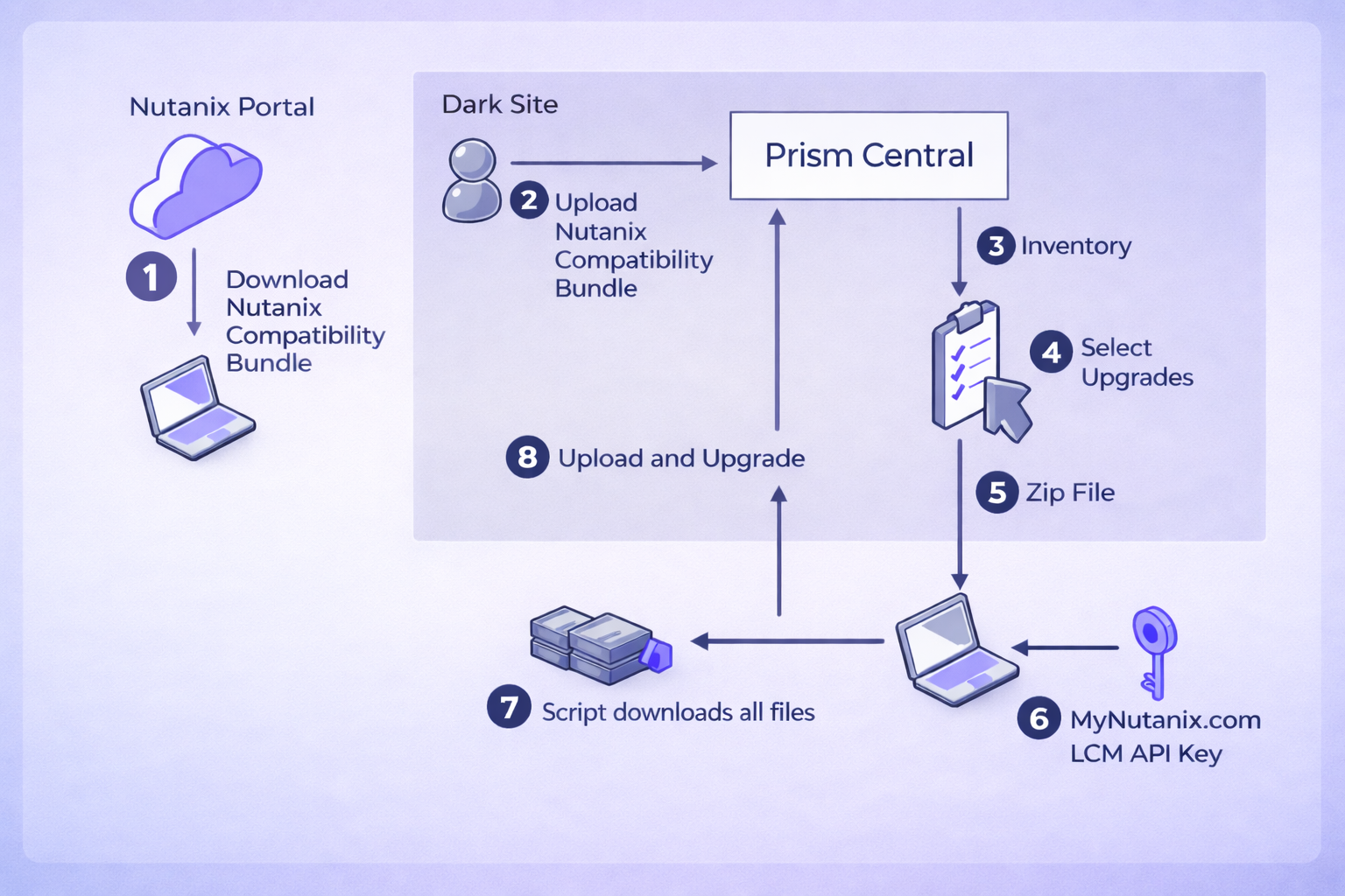 The initial interaction with the Nutanix portal is deliberately kept outside the dark site boundary. That step is limited to retrieving compatibility information and does not introduce any runtime dependency on external services.